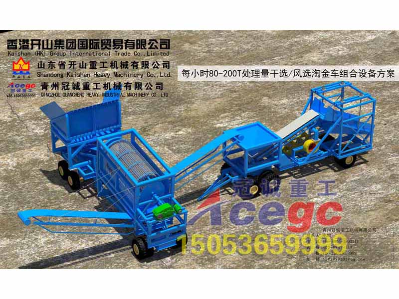 小于8MM的物料由輸送機送入一臺風選金淘金車進行風力精選,將含金礦料留在搖床內部,不含金的廢料排出至廢料區(qū)域;